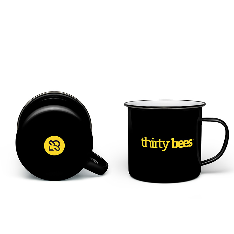 The stylish thirty bees logo tin cup, perfect for tea.